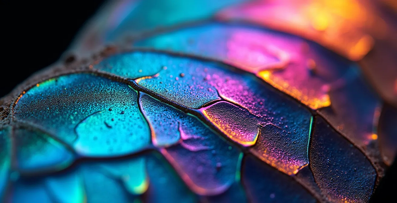 Invece di basarsi sulla chimica, il colore strutturale emerge dalla fisica. È generato da microscopiche strutture superficiali, con dimensioni paragonabili alla lunghezza d’onda della luce, che interferiscono fisicamente con essa. Queste nanostrutture (come minuscole colonne, fori o reticoli) costringono la luce a riflettersi, diffrangersi o diffondersi in modi specifici, producendo colori vividi e spesso iridescenti, come quelli che si vedono sulle ali di una farfalla Morpho o sulle piume di un pavone. Poiché il colore non dipende da un pigmento che può degradarsi, ma dalla topografia immutabile della superficie, esso è intrinsecamente stabile. Ricerche specifiche confermano una resistenza del 100% ai raggi UV senza sbiadimento, promettendo un’eternità cromatica prima impensabile.